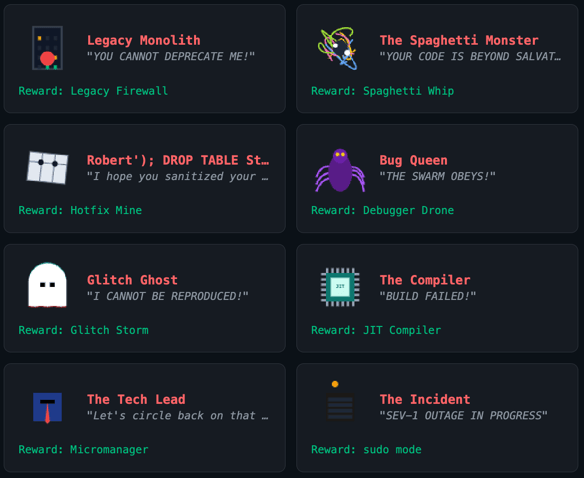 My favorite is The Tech Lead. It's protected by Junior Dev minions that buff it. You can't damage the boss until you deal with the juniors first. It teaches priority management through game design.